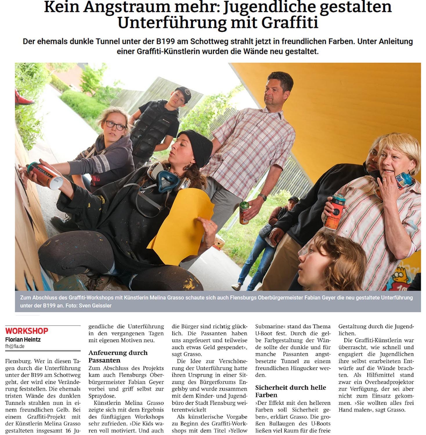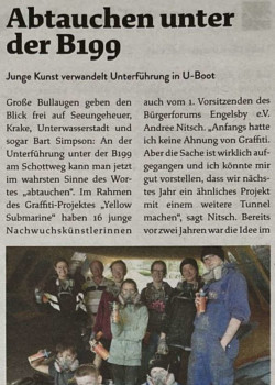 Auf einer unserer Jahreshauptversammlungen wurden wieder aktuelle Themen besprochen und am Ende, im allgemeinen Teil, kam mal wieder die Frage: Sind noch Anregungen oder Ideen da, was man für Engelsby machen könnte? Spontan meldete sich Frau K. und meinte die Unterführungen unter der B199 müssten verschönert werden. Sie berichtete von dem Tunnel an der Exe, das dieser ja toll aussieht, und meinte vielleicht könnte man ja auch so etwas organisieren.