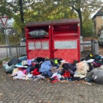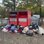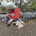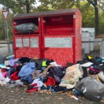 Altkleidercontainer und drum herum nicht nur Kleider in Tüten sondern inzwischen auch Restmüll. Das lockt die allgegenwärtigen vierbeinigen